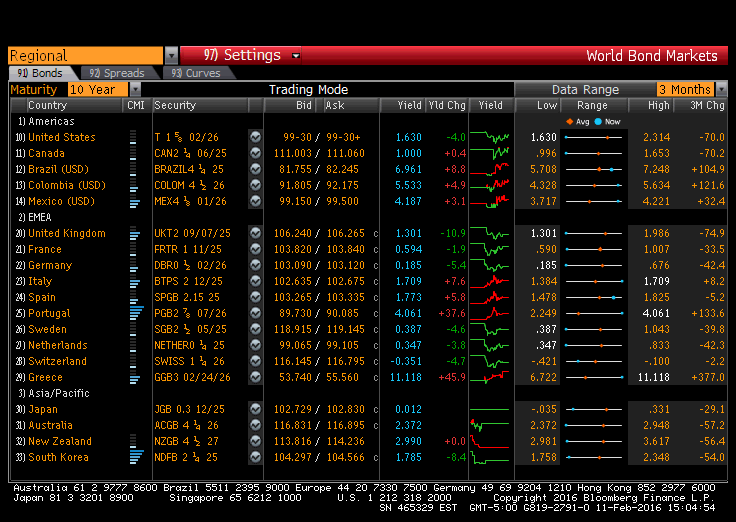 World Bond Markets allows us to monitor and chart sovereign bond yields, spreads, and historical performance on one screen, so we can synthesize the sovereign debt information we need to make quick decisions. Along with current yields and spreads, World Bond Markets displays current rates' statistical deviation from averages, so we can confidently assess yield/spread values and pinpoint anomalies. World Bond Markets is also a gateway to additional world bond market intelligence, offering us a comprehensive view of the sovereign bond market for the individual countries that appear in World Bond Markets.